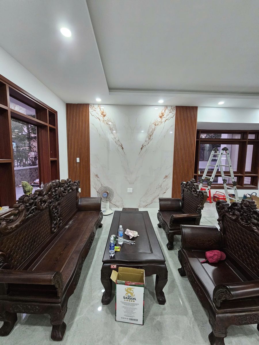 thi công vách phòng khách trang trí tấm lam 4 cao va tranh tráng gương phủ ceramic siêu bóng tại hòa lợi phường bến cát