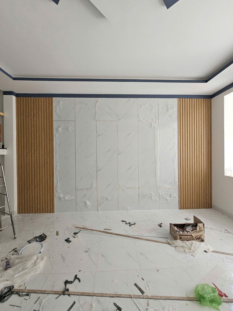 TRANG TRÍ TẠO ĐIỂM NHẤN VÁCH PHÒNG KHÁCH BẰNG TẤM PVC VÂN ĐÁ KẾT HỢP TẤM LAM 3 SÓNG LÀM ĐIỂM NHẤN SANG TRỌNG ĐƠN GIẢN TẠI PHƯỜNG UYÊN HƯNG TÂN UYÊN THÀNH PHỐ HỒ CHÍ MINH